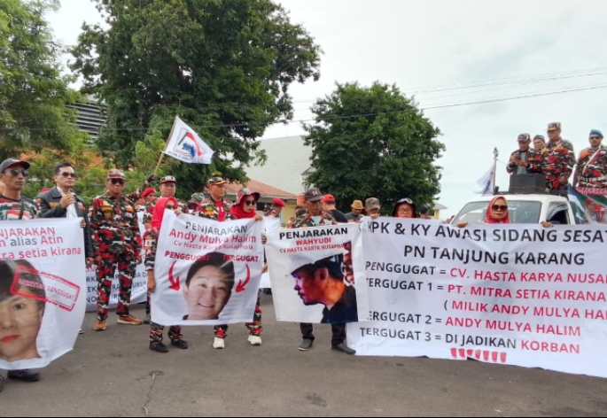 Ratusan anggota Laskar Merah Putih yang dipimpin oleh Ketua Umum H. Adek Ervil Manurung, SH, menggelar aksi damai di depan Pengadilan Negeri Tanjung Karang. Aksi tersebut menuntut pengadilan untuk mengkaji ulang kasus dugaan penipuan dan penggelapan bermodus kerja sama usaha yang melibatkan Titin, Andy Mulya Halim, dan Hadi Wahyudi.(9/1/2025)
